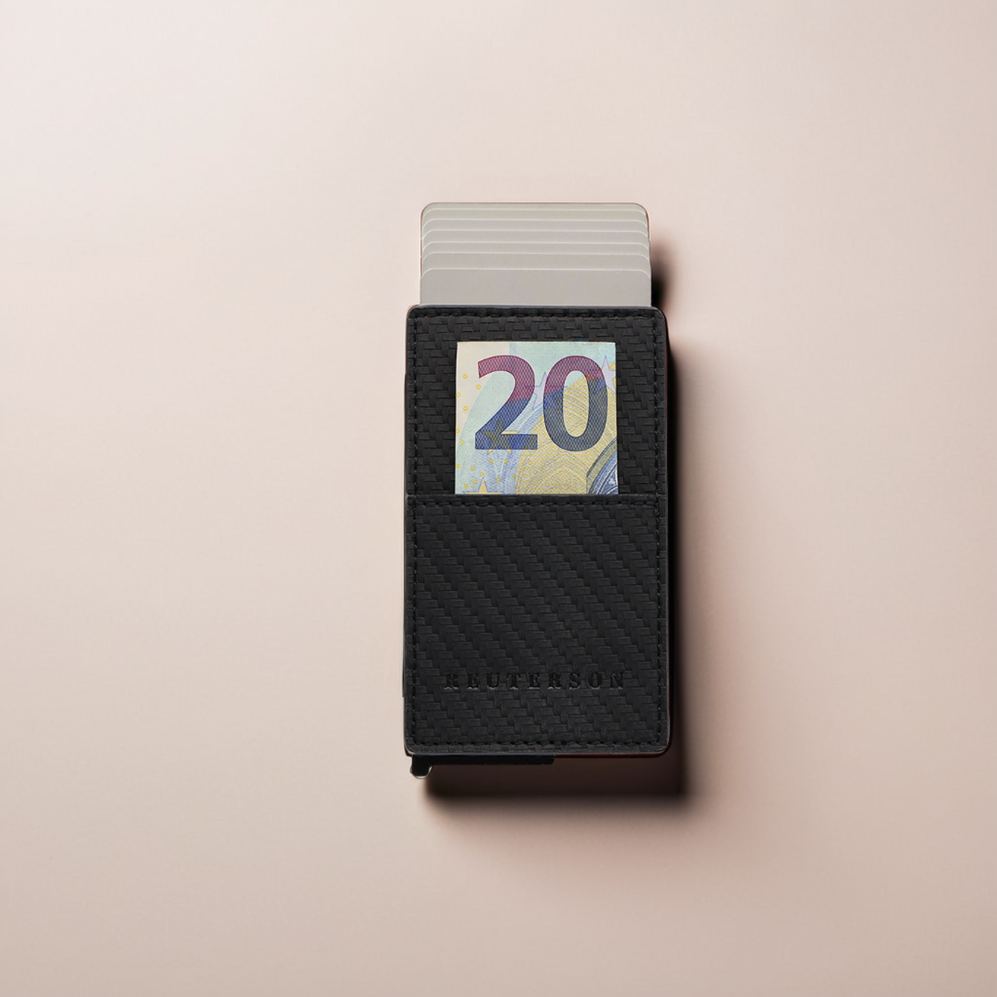 La billetera de alta calidad de carbono con mecanismo deslizante, compartimento para billetes y compartimento para monedas – para máxima funcionalidad en un diseño elegante.