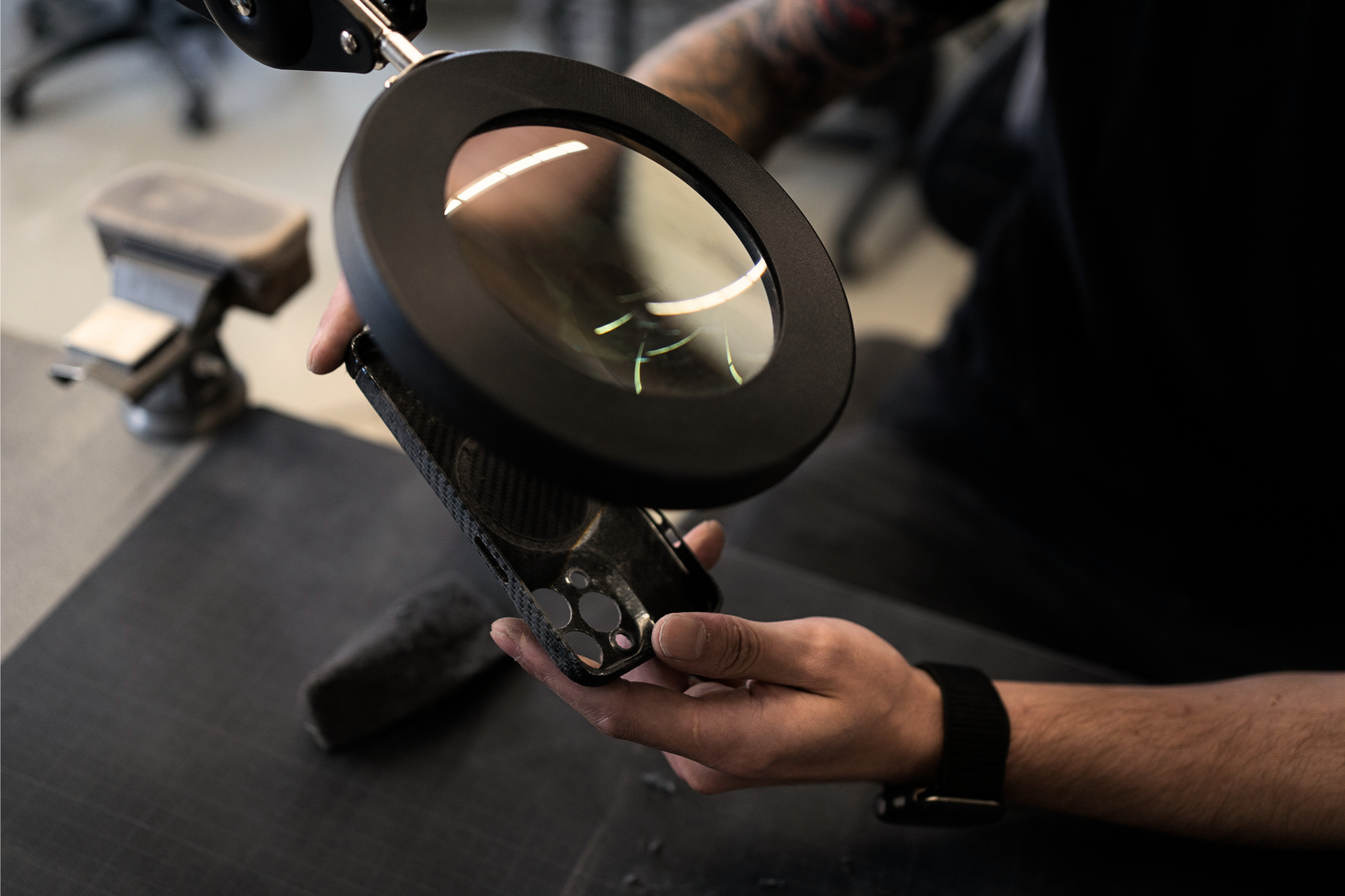 Cada una de nuestras fundas está formada por millones de fibras de carbono individuales. Fabricadas a mano para ajustarse a cada smartphone con una precisión de una décima de milímetro.